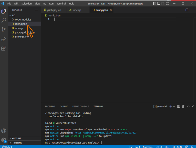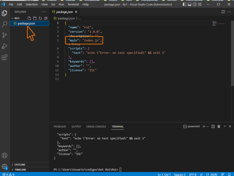 Esto nos creará el package.json que es un archivo en formato json, que es en sí la configuración del proyecto, en este caso nuestro bot, por lo que encontraremos información dentro como la de: