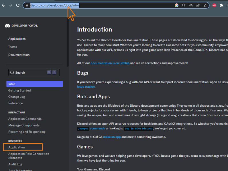 En la pagina principal de discord.com, nos vamos a la parte inferior y encontraremos la sección de discord para desarrolladores, o podemos usar la url https://discord.com/developers/docs/intro