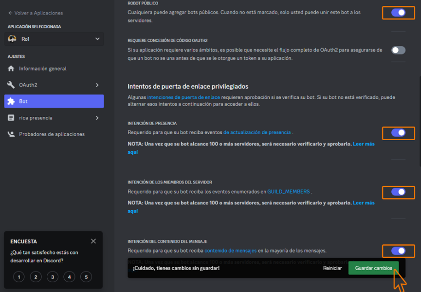 Podemos comenzar a poner imágenes y descripción de nuestra aplicación, pero lo que nos interesa es que funcione como bot, así que nos vamos a la sección de “Bot” y marcamos las casillas de cómo queremos que se autoricen los controles de OAuth2 para nuestro bot, en mi caso el bot no será de libre acceso público, pero lo que sí es importante, es marcar las casillas siguientes: