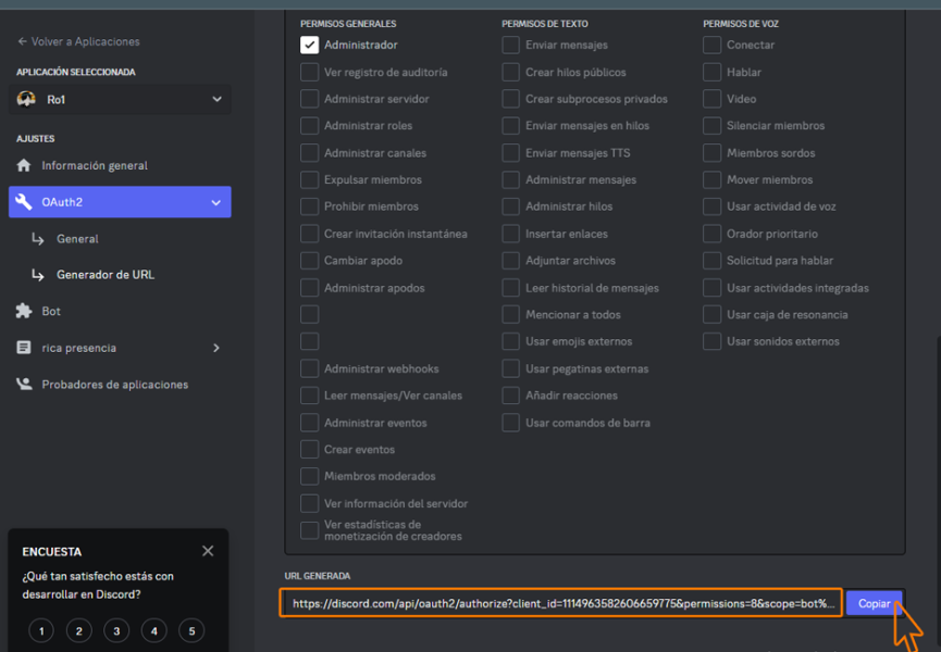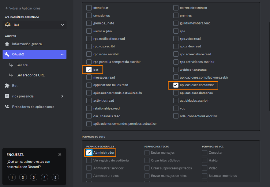 Vamos a la sección de OAuth2 y a la sección de Generador de URL y en “ámbitos” seleccionamos las casillas de bot y la de aplicaciones de comando y en “permisos de bot” seleccionamos la casilla de administrador