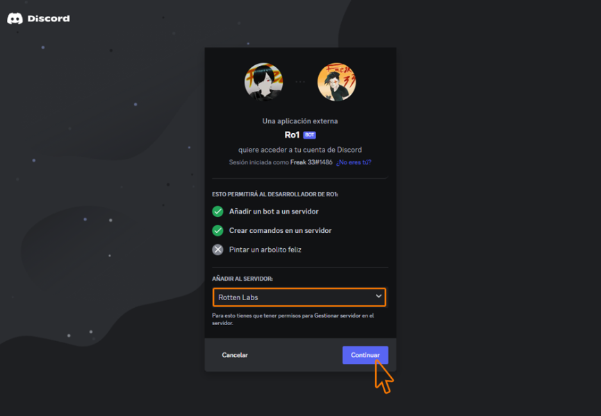 Esa url la ponemos en el navegador y entonces podemos elegir a qué servidor que tengamos, agregaremos el bot, y por supuesto hay que dar nuestra autorización.