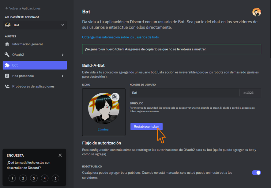 Hasta aquí solo dimos de alta nuestra aplicación y la configuración del bot de esta aplicación, pero aun no está conectado a nuestro proyecto, para eso hay que ir por el token.