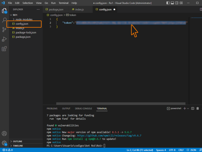 Y ahora sí, regresamos a nuestro código y en el archivo de config.json colocamos entre llaves el identificador de token y entre comillas nuestro token copiado
