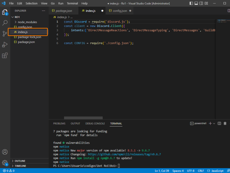 Luego vamos a nuestro archivo index.js y mandamos a llamar a las dependencias de discord y las de configuración de nuestro token para que se conecte a nuestra aplicación y así funcione como bot en discord